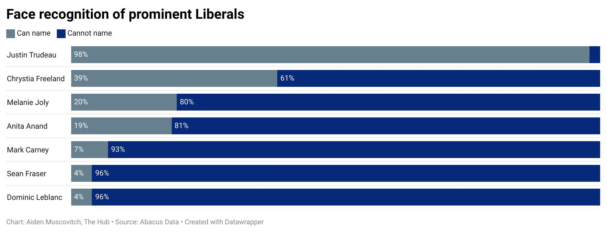 While 98 percent of Canadians recognize Trudeau, less than 40 percent could name Deputy Prime Minister and Minister of Finance Chrystia Freeland. This comes after loud rumblings that Freeland could soon be out of a job due as the party tries to assign blame for a historic loss in a recent Toronto by-election.
