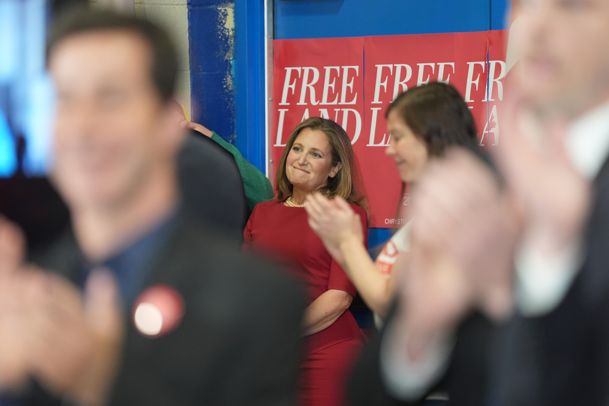 Chrystia Freeland smiles as her children introduce her at a press conference in Toronto on Sunday Jan. 19, 2025, where she kicks off her campaign to become the next Liberal party leader. Frank Gunn/The Canadian Press.