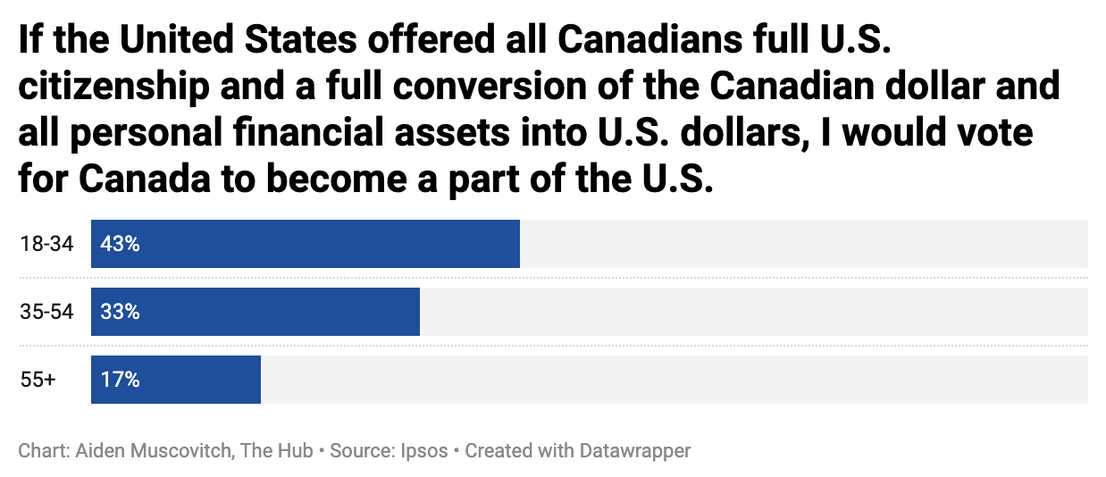 A recent Ipsos poll found that over 40 percent of Canadians between the ages of 18 and 34 would vote for Canada to become the 51st American state, if the U.S. offered all Canadians full U.S. citizenship, a full conversion of the Canadian dollar, and all their personal financial assets to converted into U.S. dollars.