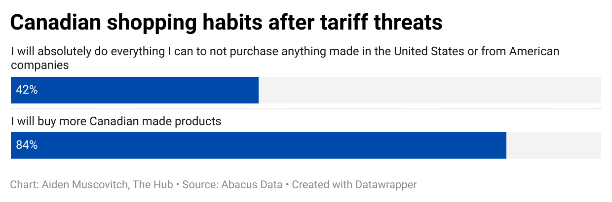 Despite a potential hike in the costs of Canadian goods and the scarcity of “Products of Canada,” 42 percent of Canadians have expressed intent to avoid purchasing U.S.-made products by any means necessary. The poll also found that 84 percent of Americans plan to increase their consumption of Canadian-made products.