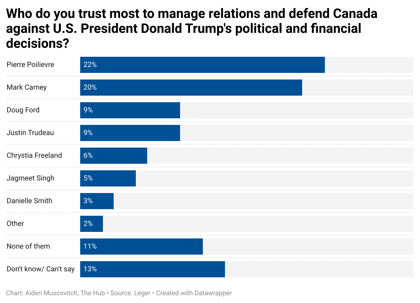 When asked who they trust most to manage relations with our neighbour to the south and defend our interests against President Trump, Conservative Party leader Pierre Poilievre and Liberal Party leadership hopeful Mark Carney are nearly tied at 22 and 20 percent, respectively. Ontario Premier Doug Ford and Prime Minister Justin Trudeau follow at 9 percent each. They are ahead of former deputy prime minister and Liberal leadership candidate Chrystia Freeland, NDP leader Jagmeet Singh, and Alberta Premier Danielle Smith.
