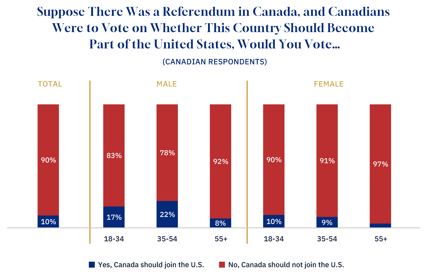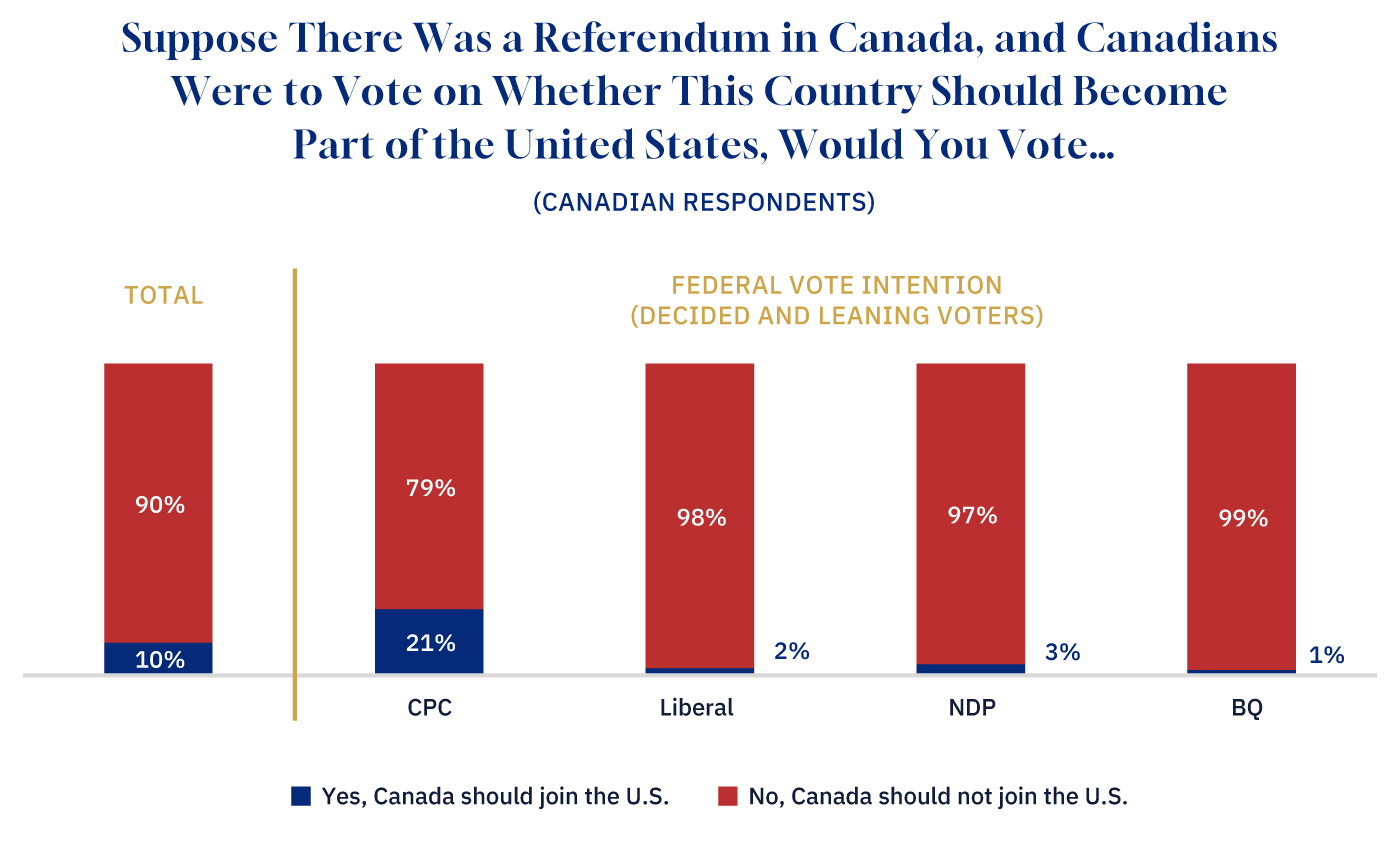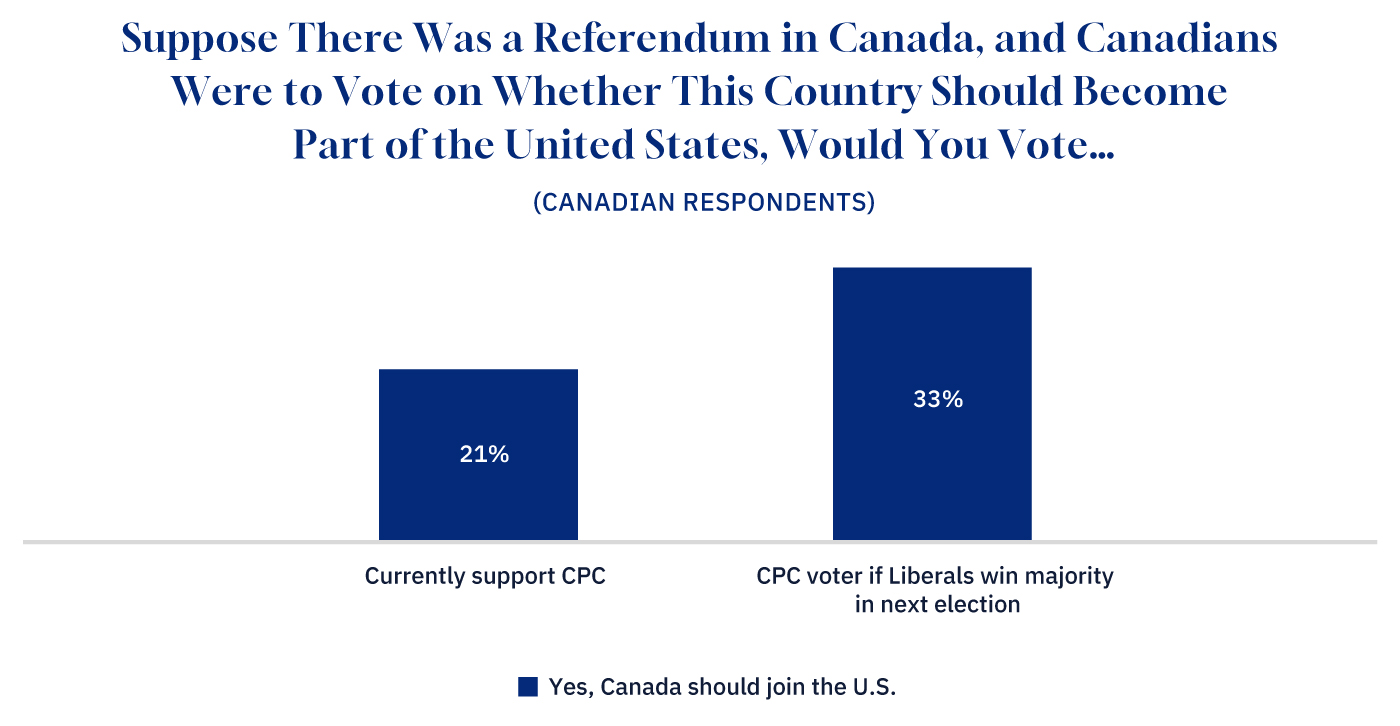 - One-fifth of Canadian Conservatives are open to joining the U.S.: While the majority of Conservative voters oppose joining the U.S., a significant minority (21 percent) support the idea. This number rises to 33 percent if Conservative voters are presented with the prospect of Liberals winning a majority in the next election.