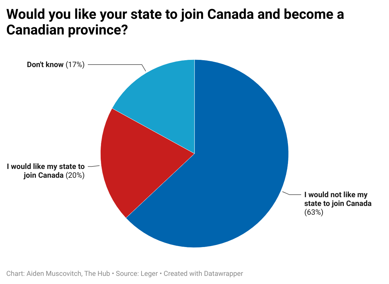 In the midst of 51st state chatter and tariff escalation, a recent Leger survey found that 20 percent of Americans would like their state to join Canada. About 63 percent of Americans would not like their state to join Canada as a province, and 17 percent are unsure. However, only 9 percent of Canadians think a Canadian annexation is likely.