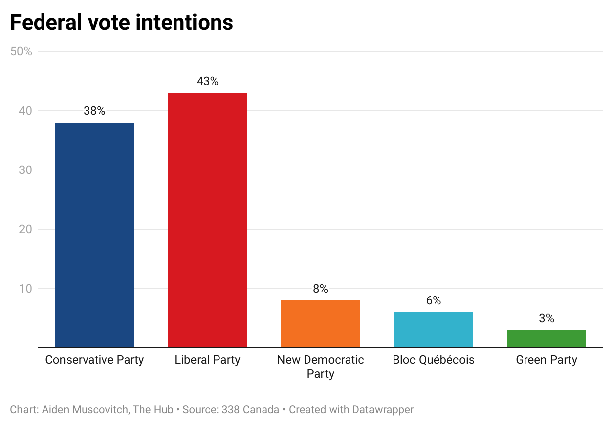 As the campaign enters week two, the Liberals are holding their lead. At the time of writing, the Grits are at a polling average of 43 percent of the voter share, compared to the Conservatives’ 38 percent, according to polling aggregator 338Canada. The NDP is sitting at a mere 8 percent.