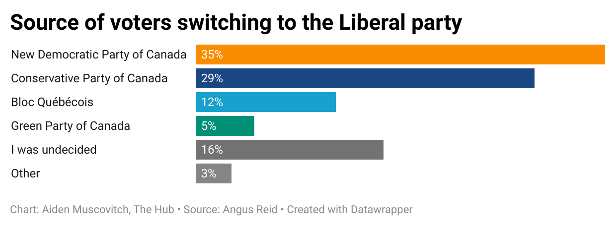 35 percent of new Liberal supporters were NDP supporters, just under 30 percent were Conservative