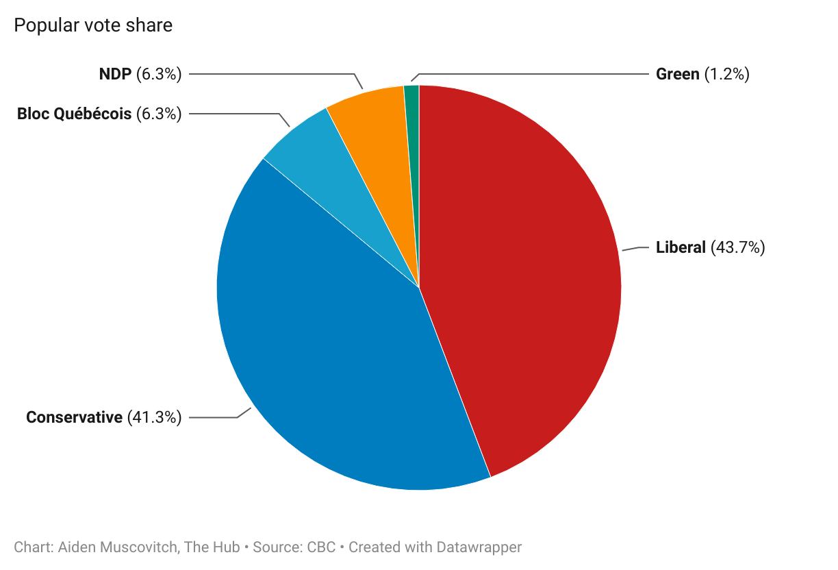 The Liberals benefited from this high voter turnout, as they eked out a narrow win. The Liberals gained 11 points in the popular vote compared to their performance in the 2021 election, which had a turnout of 62 percent. However, Ipsos CEO Darell Bricker described in The Hub that this win is not a Liberal triumph, but a reordering for Canada driven by fracture, not unity. Bricker argued that Carney attempted to turn the election into a referendum on Trump, which worked for the most part, but was not successful enough to hand the Liberals a majority. The reality of this election outcome, in his eyes, is that Canada is very divided, as demonstrated in the split popular vote.