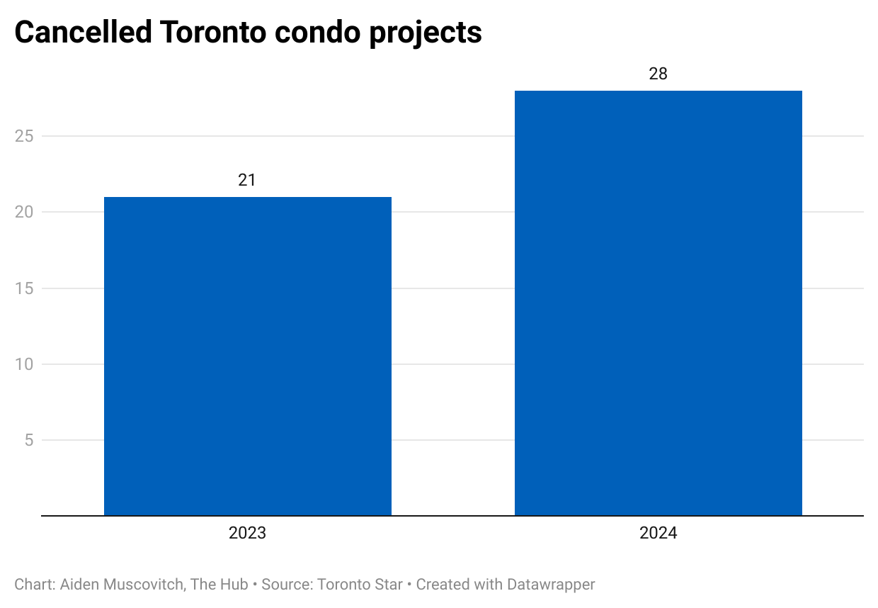 According to mid-April data published in the Toronto Star, 28 projects totalling 5,734 units in the GTHA have been cancelled, put on hold, gone into receivership, or been converted to rentals.