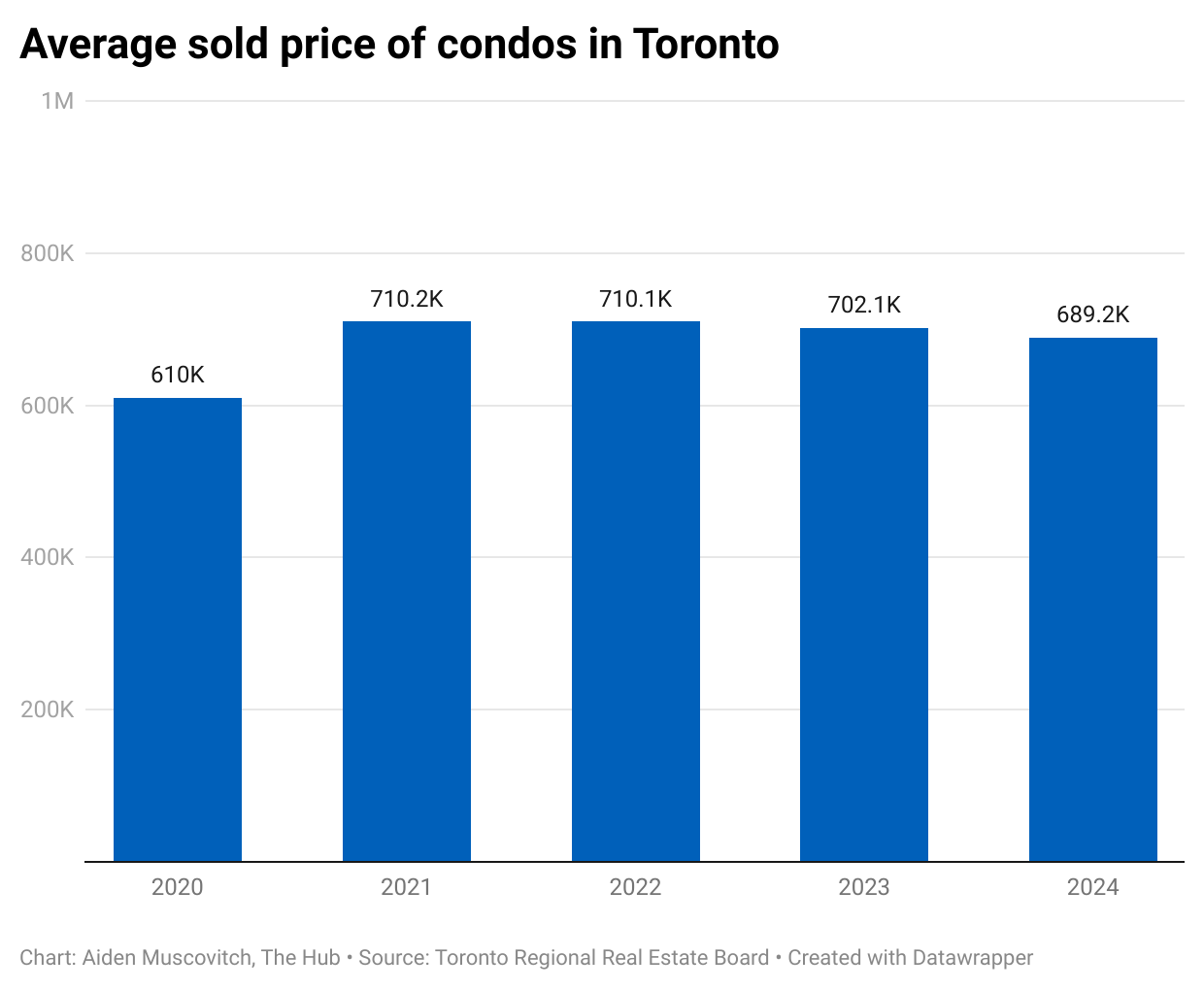 The average sold price of condos in the GTA in the fourth quarter of 2024 was just north of $689,000, a 1.6 percent decline from the fourth quarter of 2023. In the City of Toronto proper, the average selling price slightly increased from 2023 to just over $717,000.
