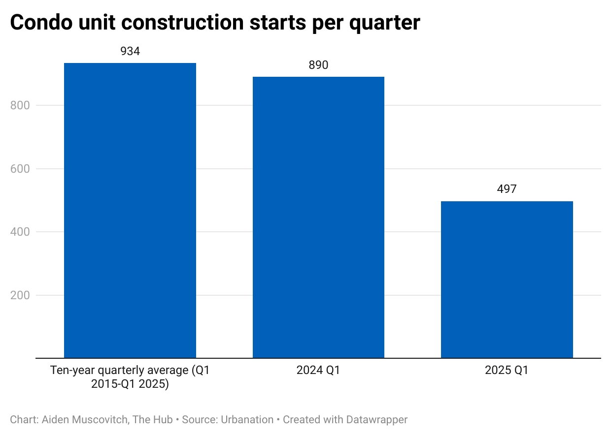 In the GTHA, construction began on 497 condominium units in the first quarter of 2025, marking a 79 percent decline from the same time a year earlier, and an 88 percent drop compared to the 10-year average, reaching the lowest quarterly figure since 1996.