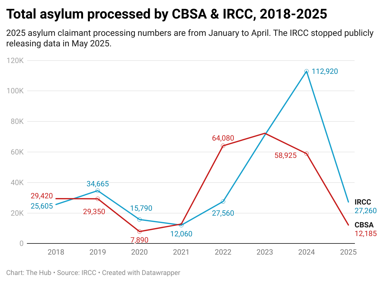 CBSA informed The Hub that the agency processed 44 percent fewer asylum claimants in the first seven months of 2025 compared to 2024 for the same time period. However, refugee claimants smuggled or who are themselves illegally crossing the border would be more likely to apply for refugee status with Immigration, Refugee, and Citizenship Canada (IRCC). Those seeking asylum in Canada, and already within the country’s borders, can register an asylum claim through IRCC’s online portal.
