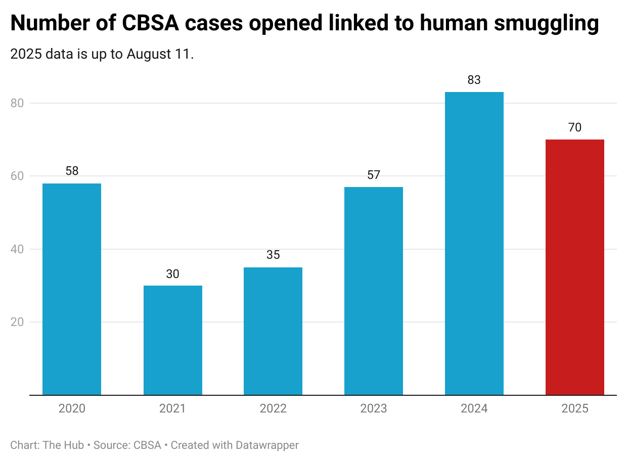 According to CBSA data provided exclusively to The Hub, for all of 2024, CBSA filed 83 cases involving human smuggling, at an average rate of 6.9 cases per month. This represented a marked rise from the 57 cases filed in 2023.