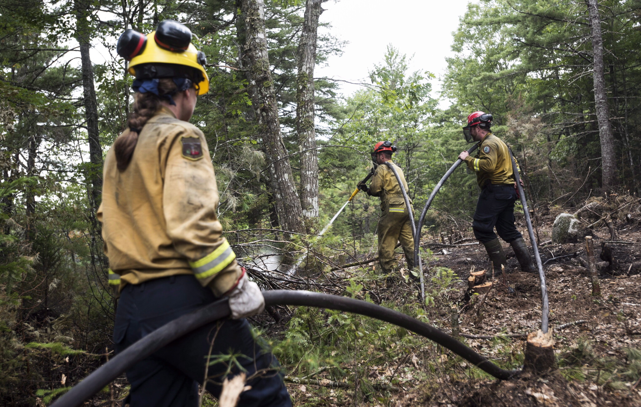 Firefighters with the Department of Natural Resources fight the Seven Mile Lake forest fire in Maitland Bridge, N.S. near Kejimkujik National Park on Thursday, August 11, 2016. Darren Calabrese/The Canadian Press.