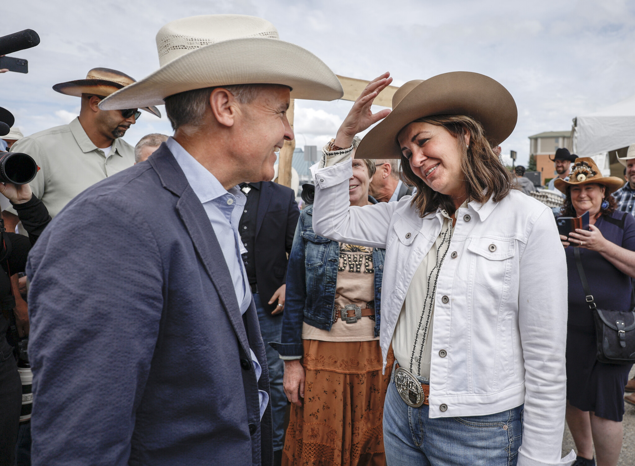 Prime Minister Mark Carney, left, meets with Alberta Premier Danielle Smith as the pair attend a Stampede breakfast in Calgary, Alta., Saturday, July 5, 2025. Jeff McIntosh/The Canadian Press.