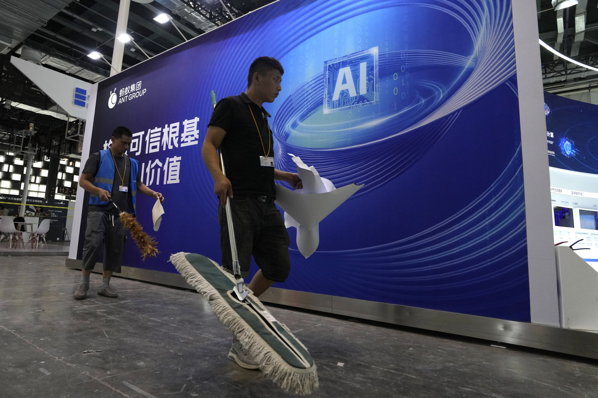A visitor past by an ad from Chinese technology provider Ant Group promoting Artificial Intelligence for the upcoming World Artificial Intelligence Conference held in Shanghai, Wednesday, July 5, 2023. Ng Han Guan/AP Photo.