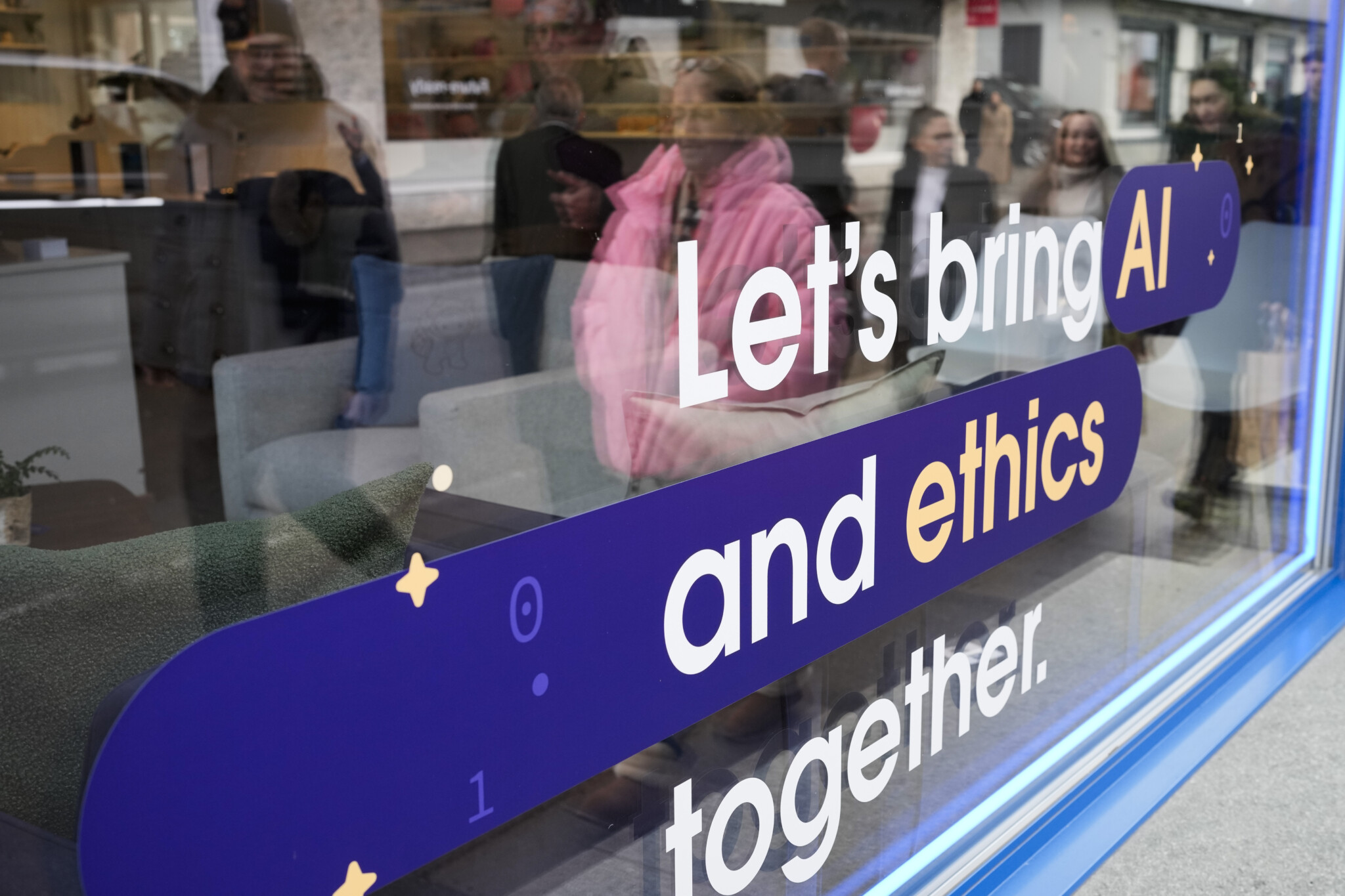 People reflected in a window of a building at the Davos Promenade with a slogan about AI alongside the World Economic Forum in Davos, Switzerland, Thursday, Jan. 18, 2024. Markus Schreiber/AP Photo.