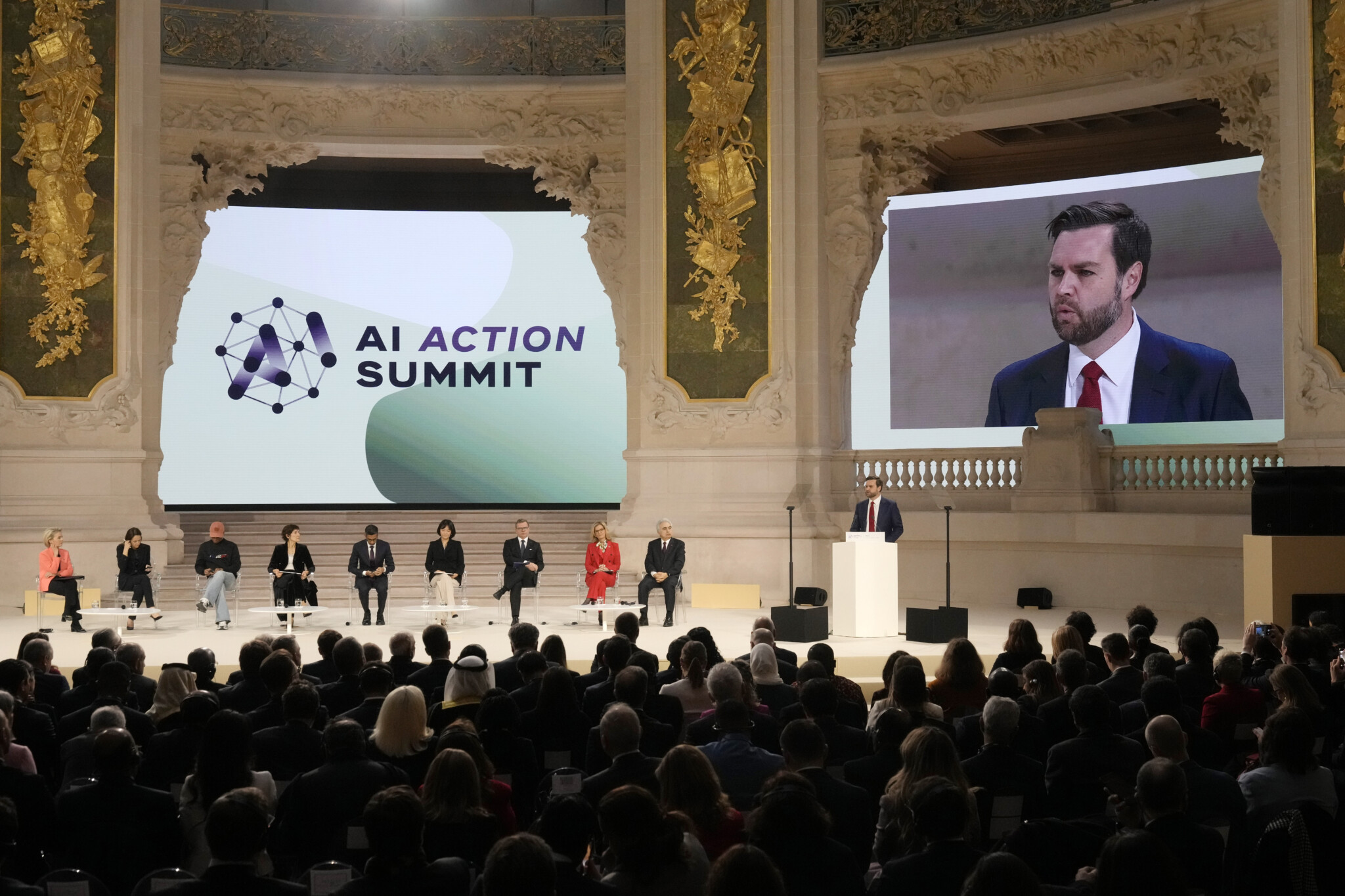 European Commission President Ursula von der Leyen, left, listens as United States Vice-President JD Vance addresses the audience at the Grand Palais during the Artificial Intelligence Action Summit in Paris, Tuesday, Feb. 11, 2025. Michel Euler/AP Photo.