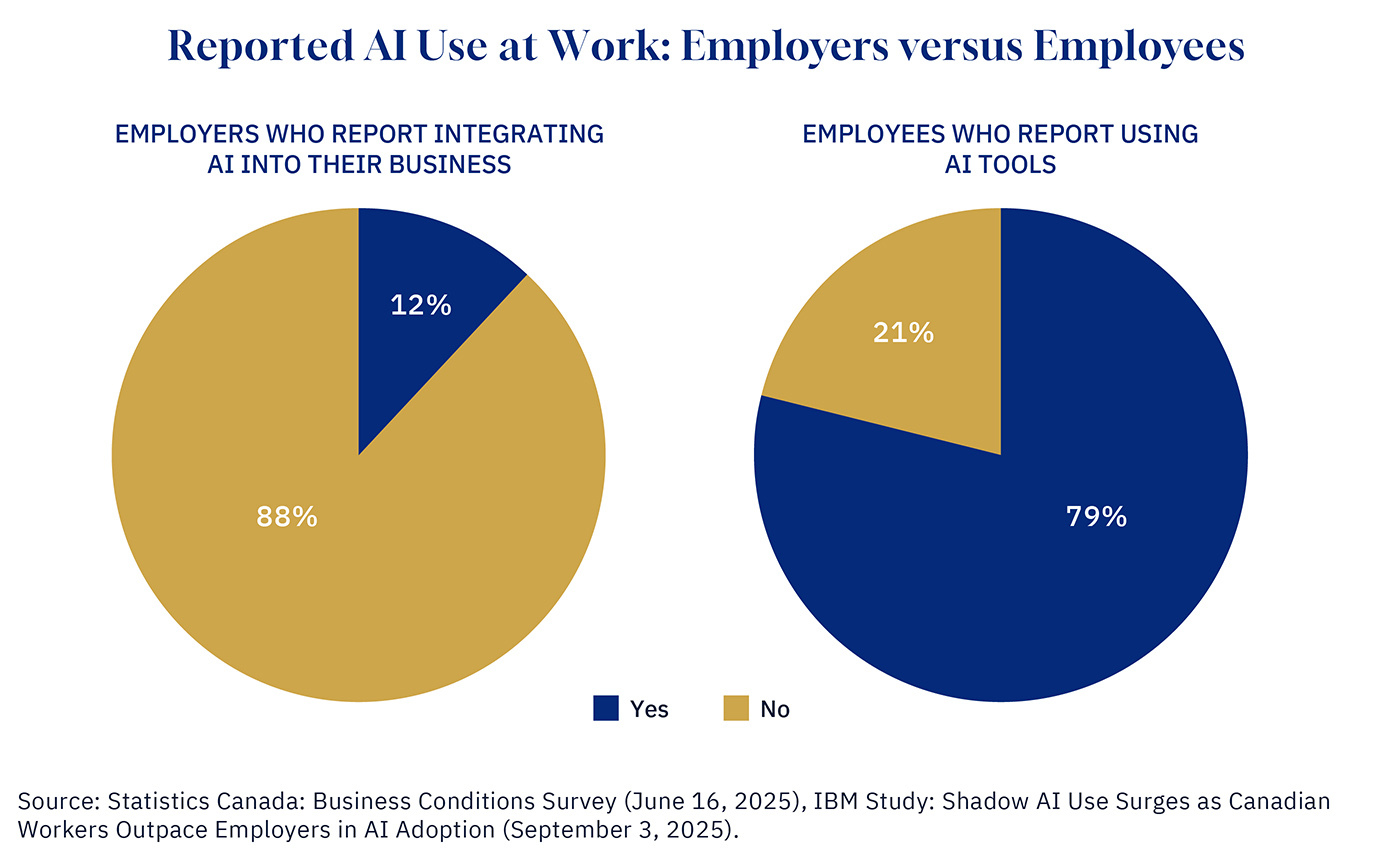 That said, AI use in the workplace is likely much higher than what employers report. IBM just released a study last week that finds 79 percent of Canadian office workers use AI.