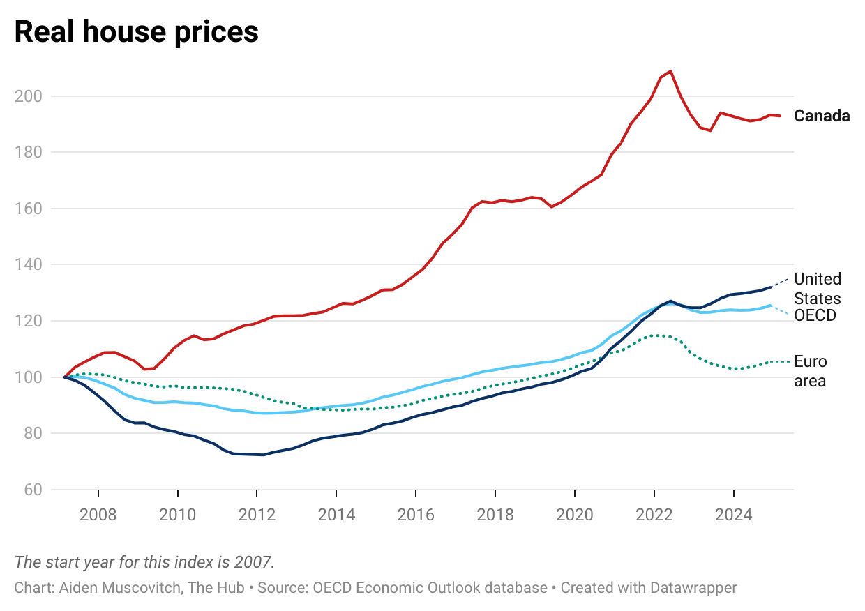 If Canada’s productivity woes are the country’s hidden illness, the housing crisis is its most visible symptom. Home prices have risen by an astonishing 120 percent since 2007—vastly outpacing income growth and placing Canada among the least affordable housing markets in the OECD. What used to be a household asset class is now a macroeconomic liability.