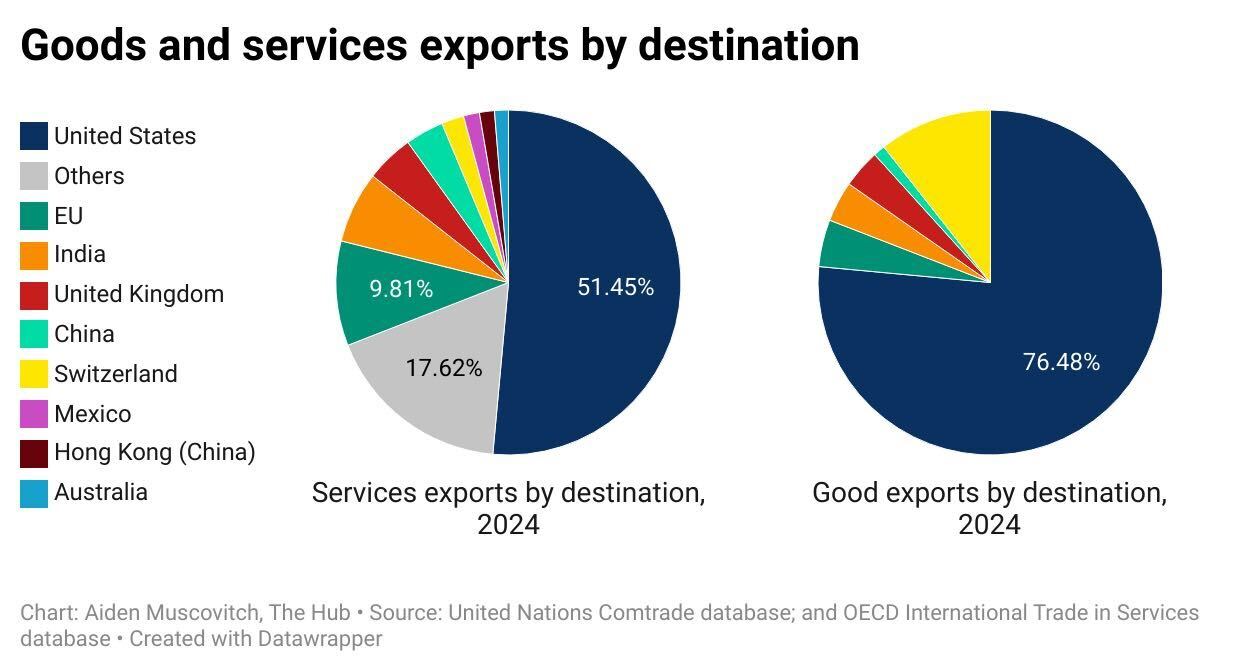 The charts below make the concentration stark: In 2024, over 76 percent of Canadian goods exports were sent to the U.S., and more than half of services exports followed suit. Canada remains uniquely exposed among advanced economies to a single trading partner.