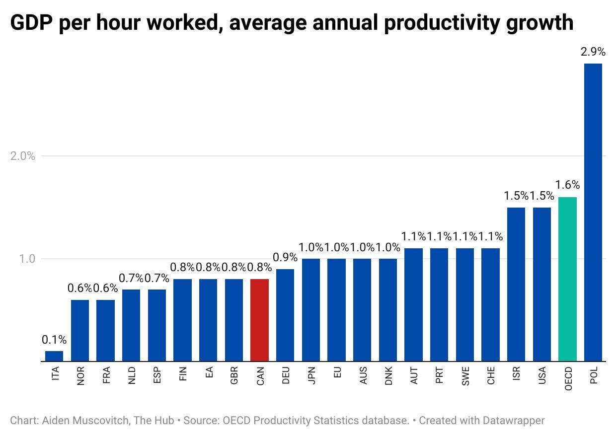 As this OECD chart shows, Canada’s average annual productivity growth over the past 20 years stands at just 0.8 percent, well below the U.S. at 1.5 percent and the OECD average of 1.6 percent. Only a handful of advanced economies, including Italy and Norway, have performed worse than this.