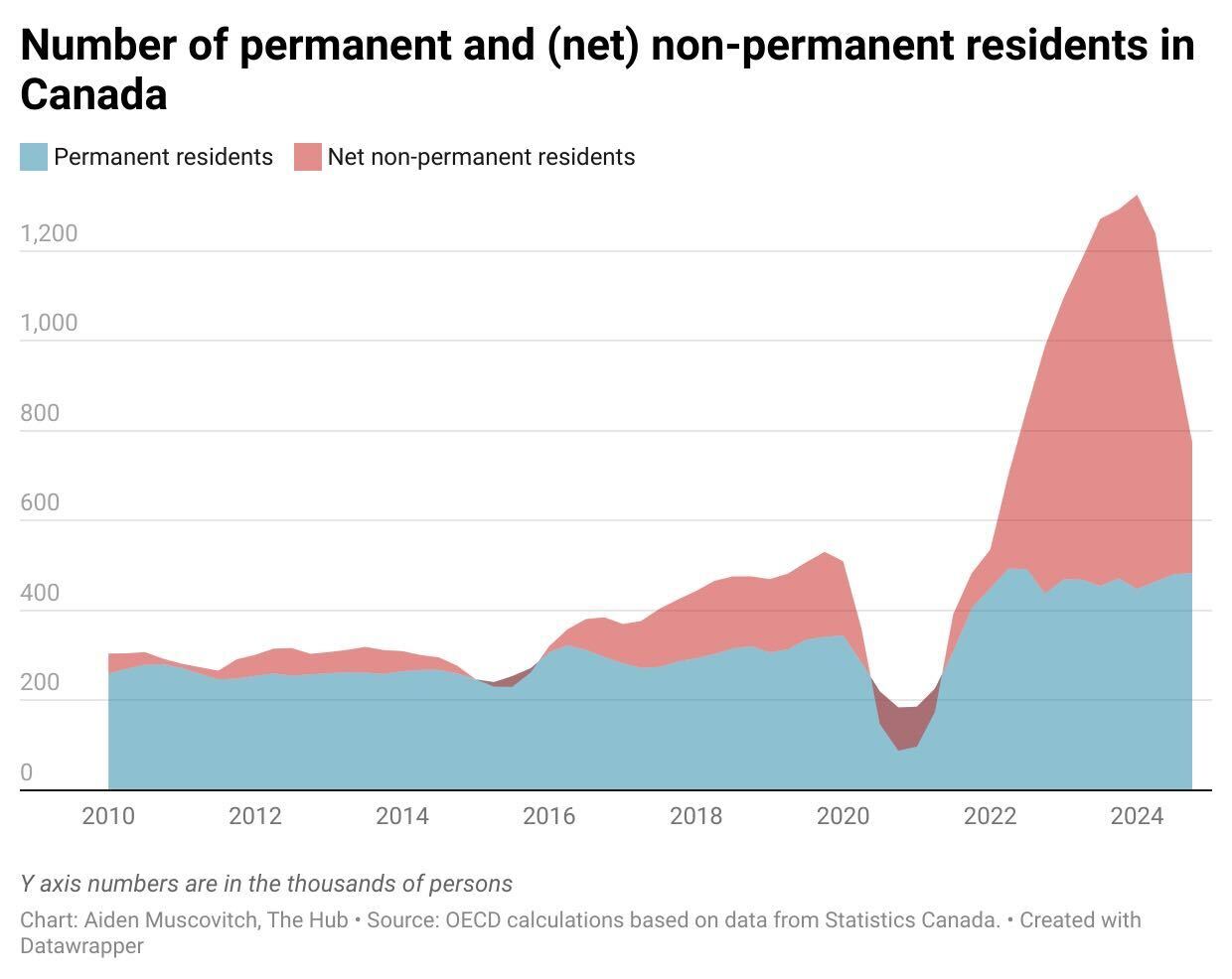 The chart below illustrates this demographic shift, with the number of net non-permanent residents rising dramatically from under 200,000 before 2022 to nearly 800,000 in 2024.