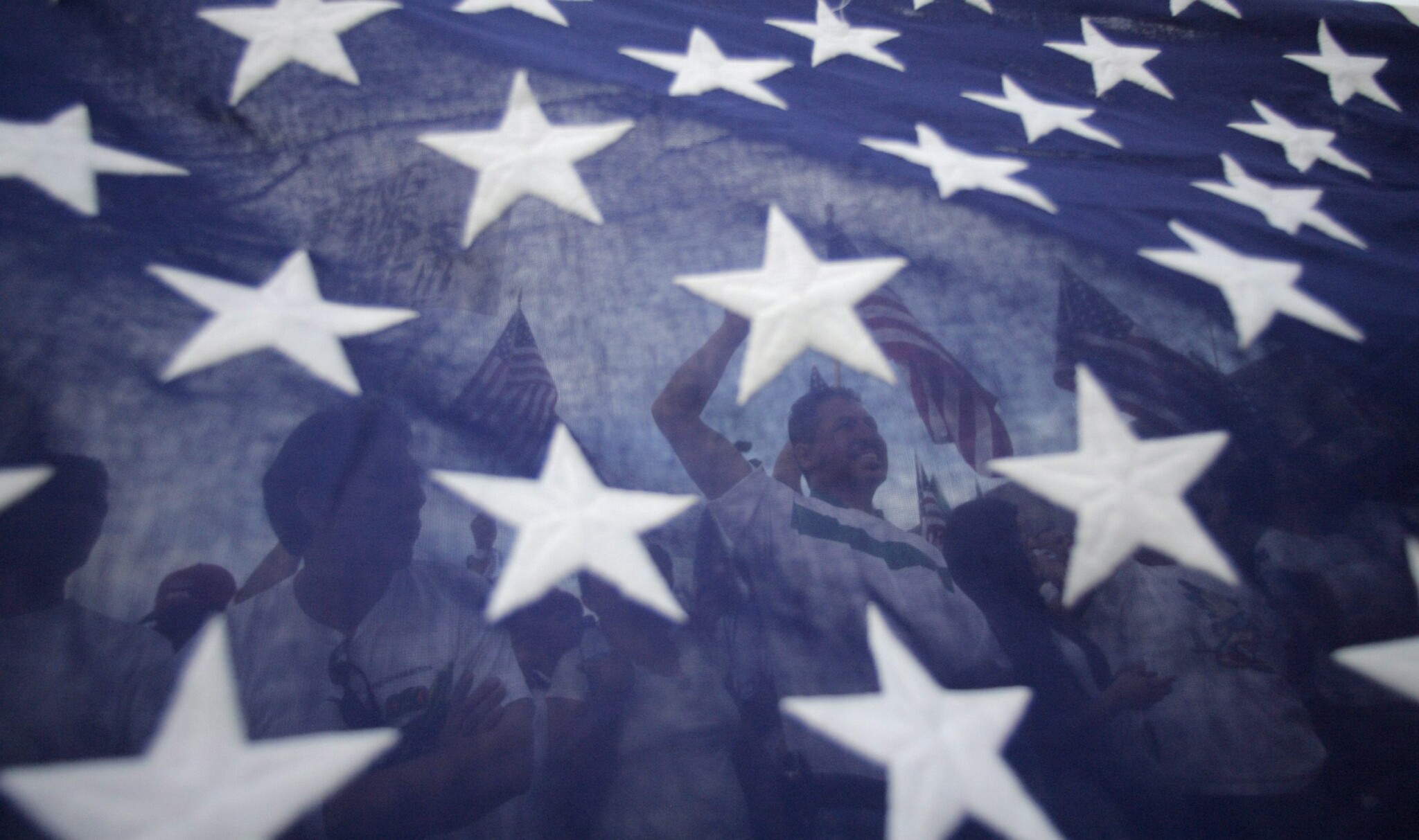 In this photo from Tuesday, May 1, 2007, protesters are seen through an American flag as they rally to support immigration reform in Las Vegas. Jae C. Hong/AP Photo.