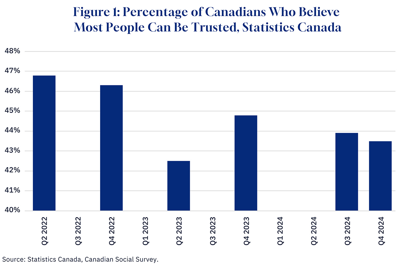 Canada consistently ranks as a high-trust country. Roughly 40 percent of Canadians tell survey researchers that most people can be trusted—though the number has been falling in recent years. According to Statistics Canada’s Canadian Social Survey, for instance, the share of Canadians who believe that most people can be trusted has fallen from 46.8 percent in Q2 2022 to 43.5 percent in Q4 2024 (see figure 1).