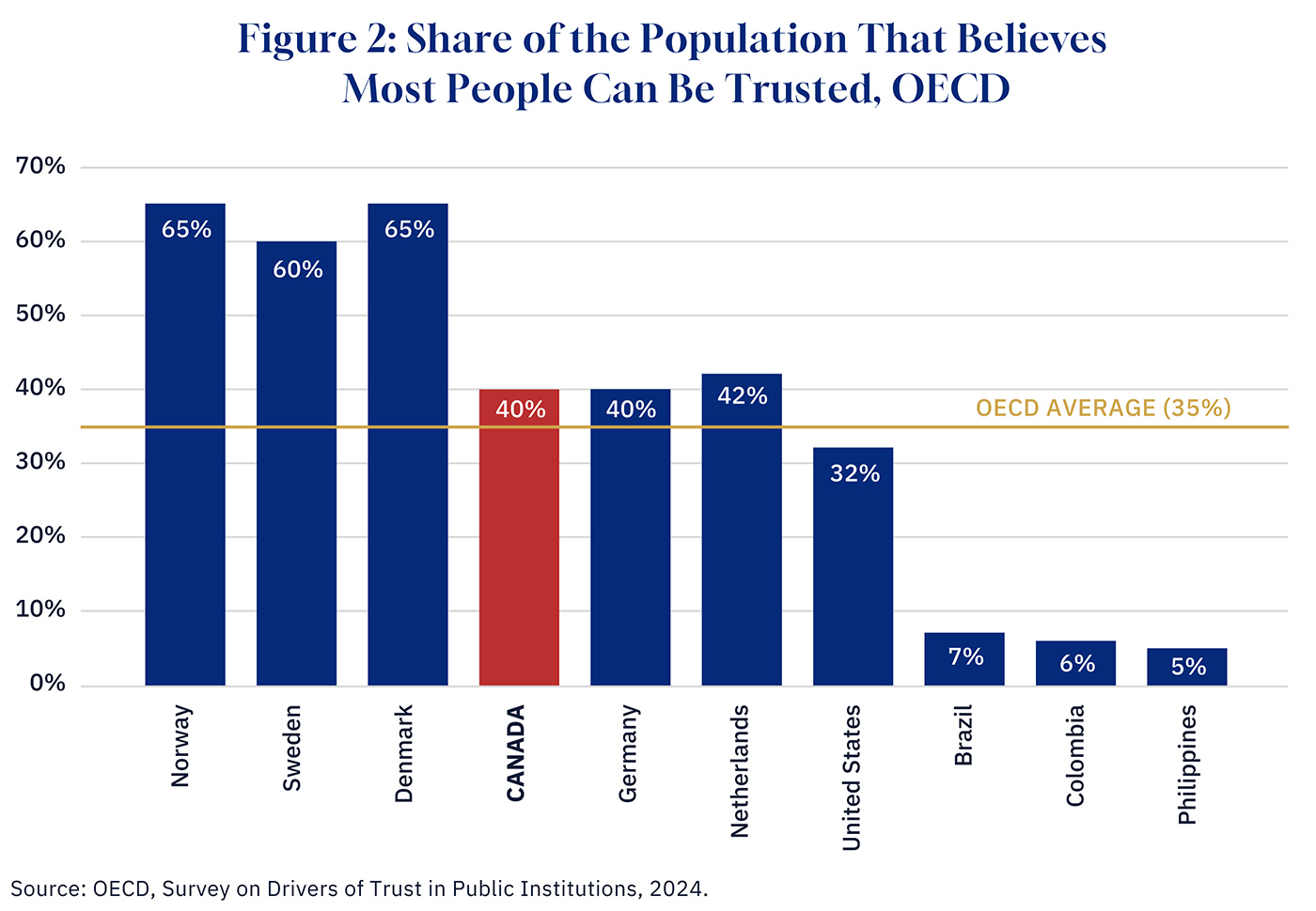 Scholars often note that only a small cluster of countries consistently report that a majority of people can be trusted. That makes Canada an outlier in the global context. Preserving that advantage has, among other benefits, major economic upside. Economic research, for instance, links a one-point rise in generalized trust to several percentage points of GDP per capita in the long run.