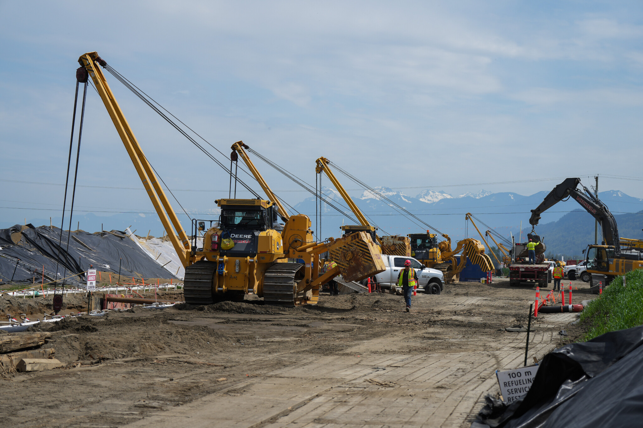 Heavy equipment is seen as workers lay pipe during construction of the Trans Mountain pipeline expansion on farmland, in Abbotsford, B.C., on Wednesday, May 3, 2023. Darryl Dyck/The Canadian Press.