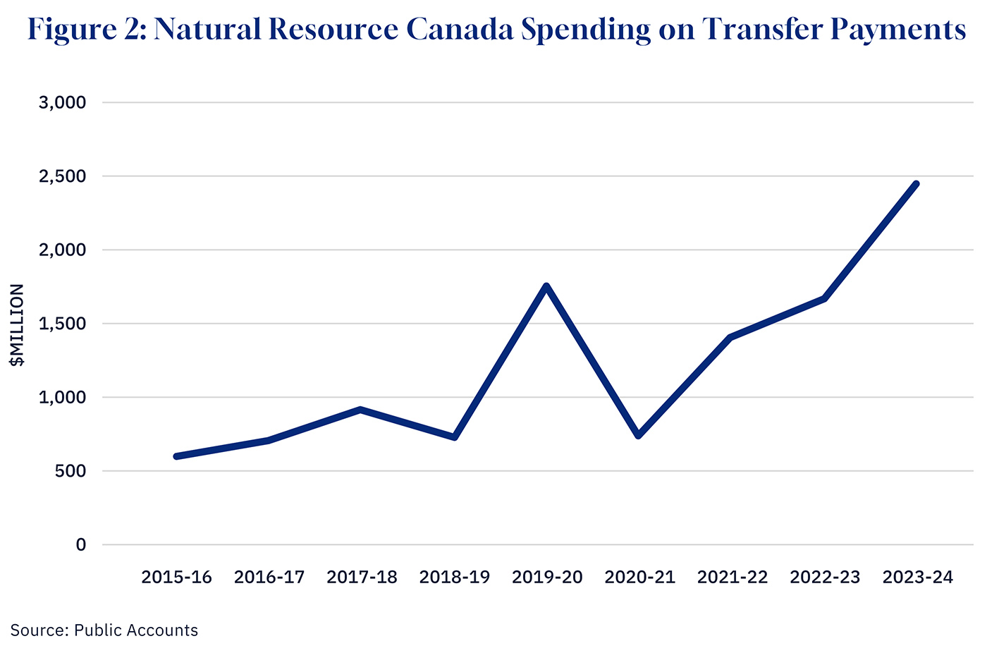 NRCan is one of the departments that has seen the fast growth in spending since 2015 (which is saying something), with its budget growing 159 percent between 2015-16 and 2023-24. This growth was mostly driven by an explosion in transfer payments. As Chart 2 illustrates, spending on transfers rose from just over $600 million in 2015-16 to just under $2.5 billion in 2023-24, a fourfold increase.