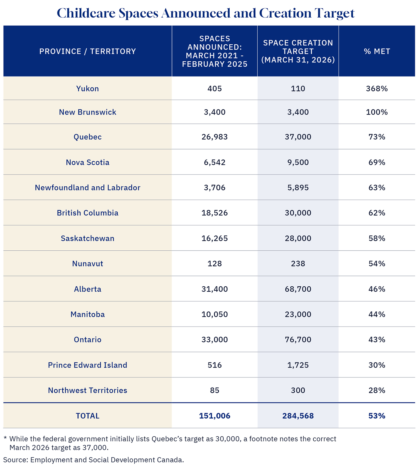 Earlier this year, the federal government provided an update on the “spaces announced” since 2021. With the caveat that the government’s figures rely on shifting definitions—this number only includes “announced measures to create” new spaces, which does little good to a parent on a waitlist—the table below compares these announced spaces to each jurisdiction’s space creation target. Because these data were from February 2025 (47 of 60 months into the federal timeline), any jurisdiction above 78 percent is, in theory, on track to meet its target. However, as of February 2025, only Yukon and New Brunswick had met their space announcement/creation goals, with Alberta, Manitoba, Ontario, PEI, and the Northwest Territories below 50 percent of their target.
