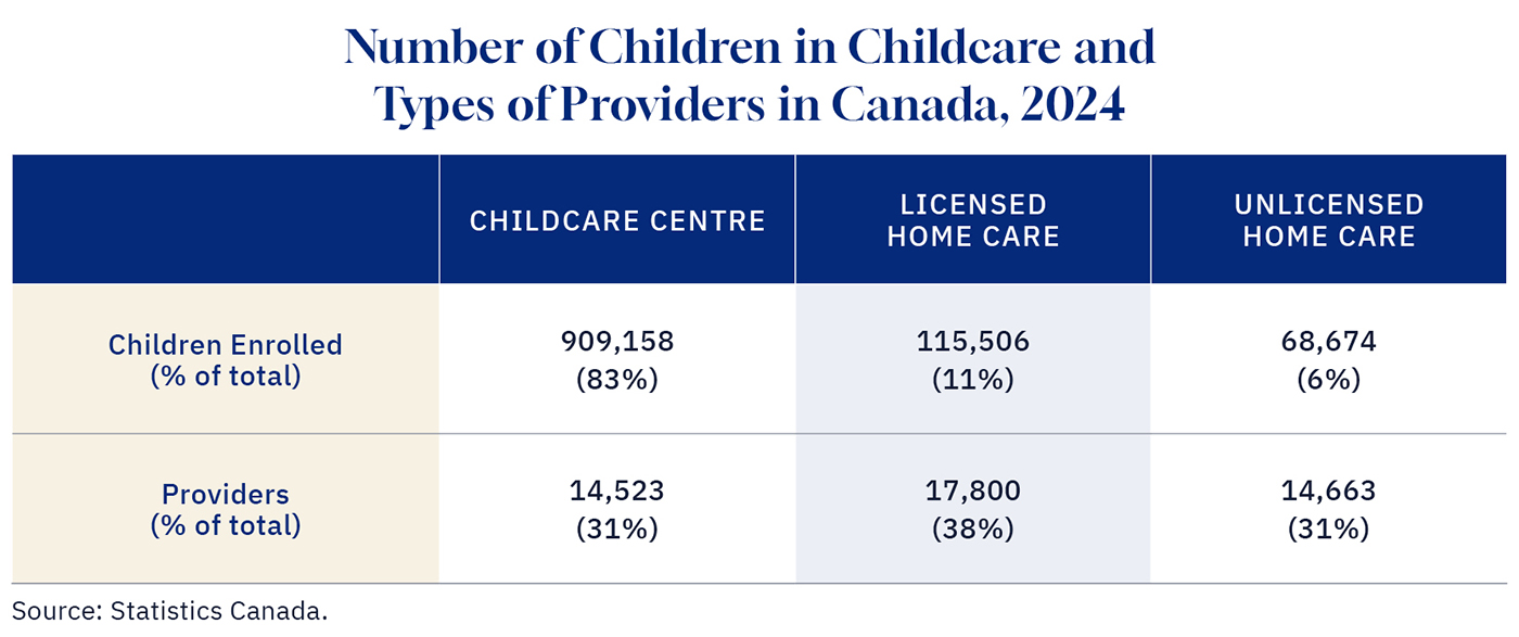 Although CWELCC subsidies are available for licensed centre- and home-based care, the post-CWELCC era has coincided with a shift away from home care. The table below, using Statistics Canada data from 2024, shows that the vast majority of children in childcare (83 percent) were in a centre rather than a home. Of those in home-based care, 63 percent were in licensed care, with 37 percent in unlicensed care. While unlicensed homes are ineligible for CWELCC funding, it is unclear precisely how many licensed homes received funding; according to Statistics Canada, only 36 percent of licensed homes across Canada had confirmed receiving CWELCC funding compared to 36 percent who had not, with 29 percent unknown.