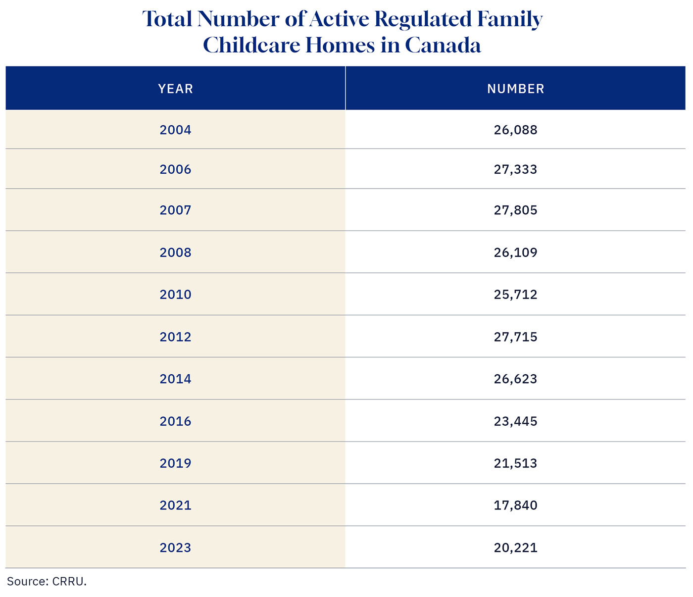 However, the post-pandemic (and post-CWELCC) period has seen a movement away from all forms of home-based care. Between 2019 and 2023, Statistics Canada reported a growth in the proportion of children aged 0-5 who were in centre-based child care, from 31.0 percent to 34.3 percent. By contrast, during this same period, the proportion of children in home-based care declined from 12.2 percent to 9 percent—a drop of more than one quarter. This period also saw a large decline in the proportion of children who were cared for by a non-relative in the child’s home (such as a nanny), from 3.0 percent of all children to 2.1 percent.