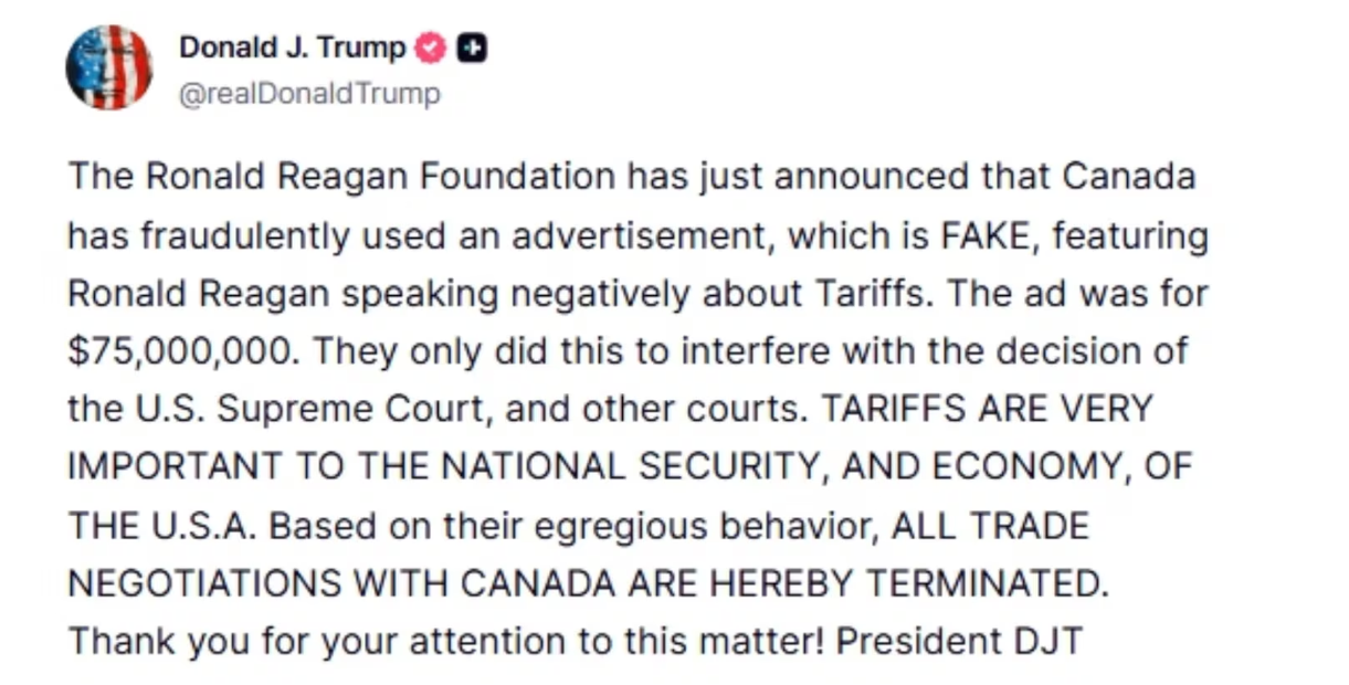 U.S. President Donald Trump says he is terminating trade negotiations with Canada following new anti-tariff ads from the Ontario government that features the voice of former U.S. president Ronald Reagan. (Truth Social)