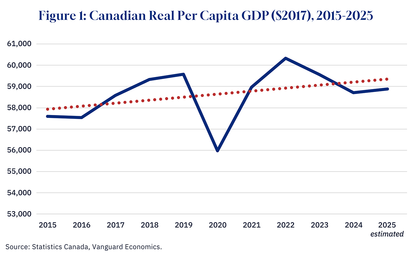 We start with real per capita GDP from 2015 to 2025 (Figure 1). The overall period is actually marked by an upward trend despite the fluctuations of the pandemic, with real per capita GDP in 2025 about 2 percent higher than in 2015. However, this is anemic real per capita growth that only averaged one-fifth of 1 percent annually over this 10-year period.