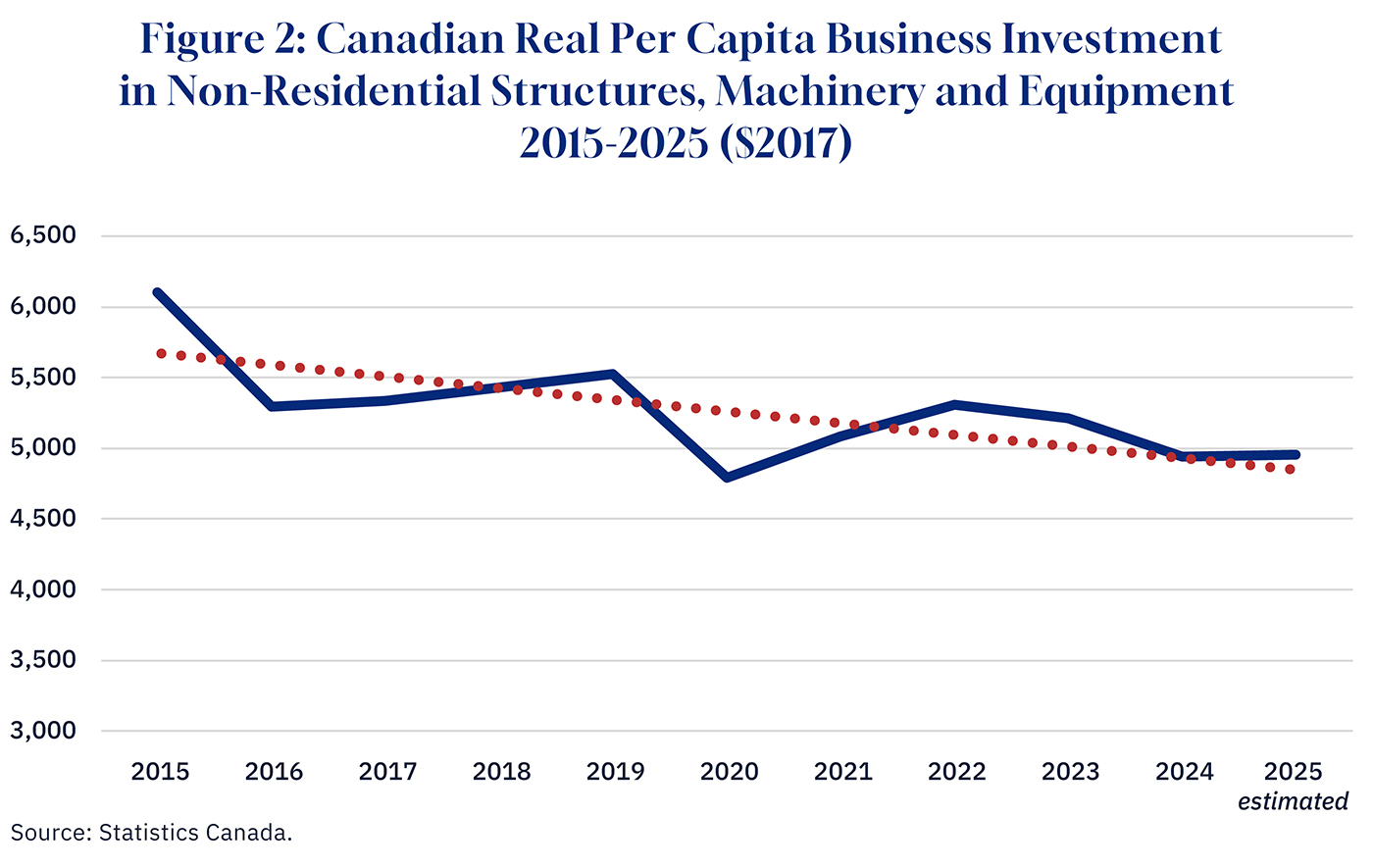 A reason for such anemic growth is best summarized in Figure 2, which plots real per capita business investment in core private sector productivity-enhancing capital formation: investment in non-residential structures, machinery, and equipment (NRSME). Between 2015 and 2025, real per capita investment in NRSME fell from $6,106 to $4,954 ($2017 dollars)—a drop of nearly 19 percent. All the government infrastructure spending in the world will not increase economic productivity if there is not rising private sector investment in plant and equipment to go along with it.