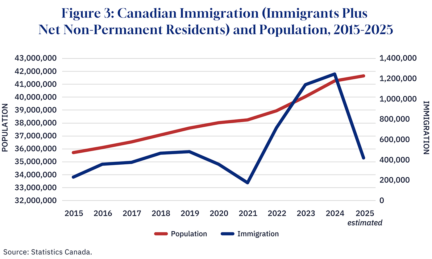 Figure 3 presents both total population and total immigration for the 2015 to 2025 period. Annual immigration ramped up gradually from 2015 to 2019, then took off dramatically after the pandemic drop to reach 718,000 in 2022, 1.1 million in 2023, and 1.2 million in 2024 before being reined in to what may be just over 420,000 in 2025. Between 2015 and 2025, Canada’s population grew 16.7 percent, going from 35.7 to 41.7 million.