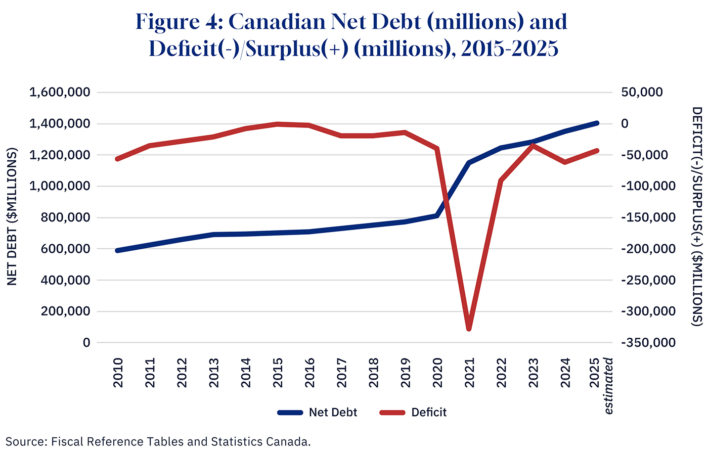Along with the extensive growth afforded by a rising population, the economy from 2015 to 2025 also received stimulus from rising government expenditure, much of which was to fight the pandemic. Figure 4 plots both the federal government’s annual deficit as well as the net debt. The Trudeau years all featured a deficit, with the accumulated deficit and assorted capital projects costing billions of dollars doubling the net debt from $701 billion in 2015 to an estimated $1.4 trillion by 2025. The net debt-to-GDP ratio also grew during this period, rising from 35.3 to about 44 percent.