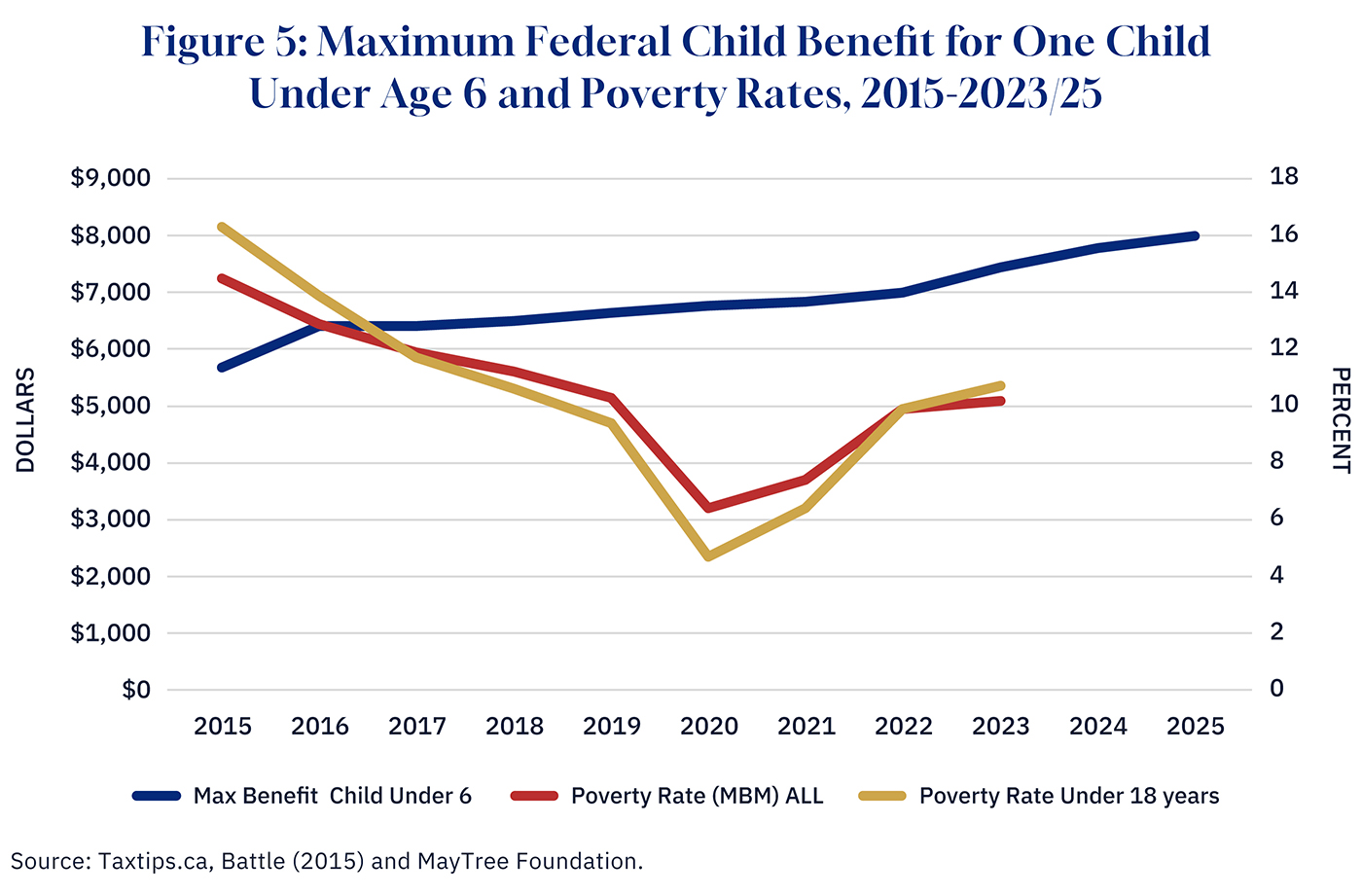 Of course, in the end, all of this spending was supposed to help the people, and particularly when it came to the enhanced child benefit, it did reduce poverty rates. As Figure 5 demonstrates, the rising value of the maximum federal child benefit for each child aged six years and under rose from under $6,000 in 2015 to nearly $8,000 by 2025—an increase of approximately 40 percent. There was indeed a decline in poverty rates, given that this was a de facto guaranteed annual income for families with children under age 18. The overall poverty rate fell substantially from 14.5 percent in 2015 to 6.4 percent by 2020, and the child poverty rate from 16.3 to 4.7 percent.