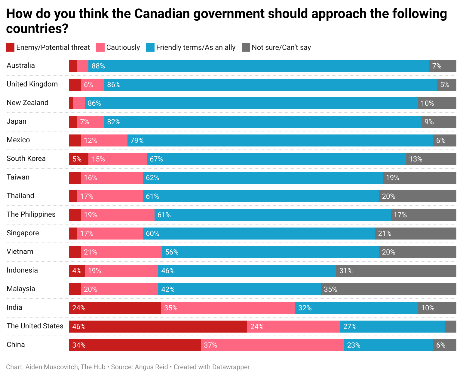 Over 45 percent of Canadians see America as an enemy, compared to less than 35 percent who think the same about China