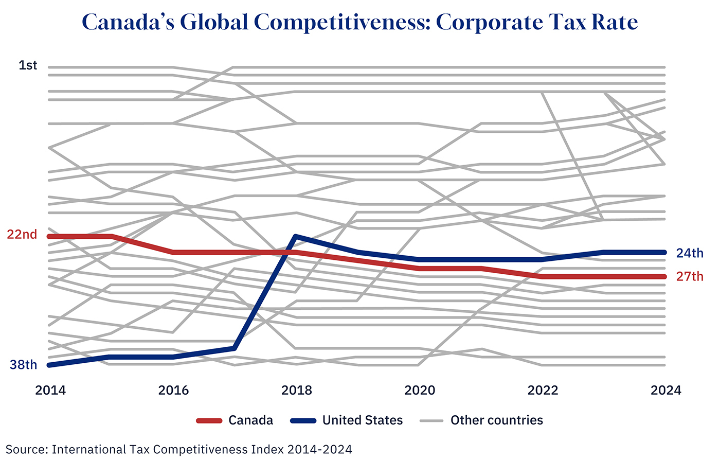 They’re also uncompetitive with our international peers. In 2012, Canada (briefly) had one of the most competitive corporate rates in the G7. Its position has steadily eroded since then, especially after the U.S. sharply cut its federal corporate tax rate from 35 percent to 21 percent through the Tax Cuts and Jobs Act in 2017. The result: Canada fell in the OECD business tax competitiveness rankings from 22nd to 27th.