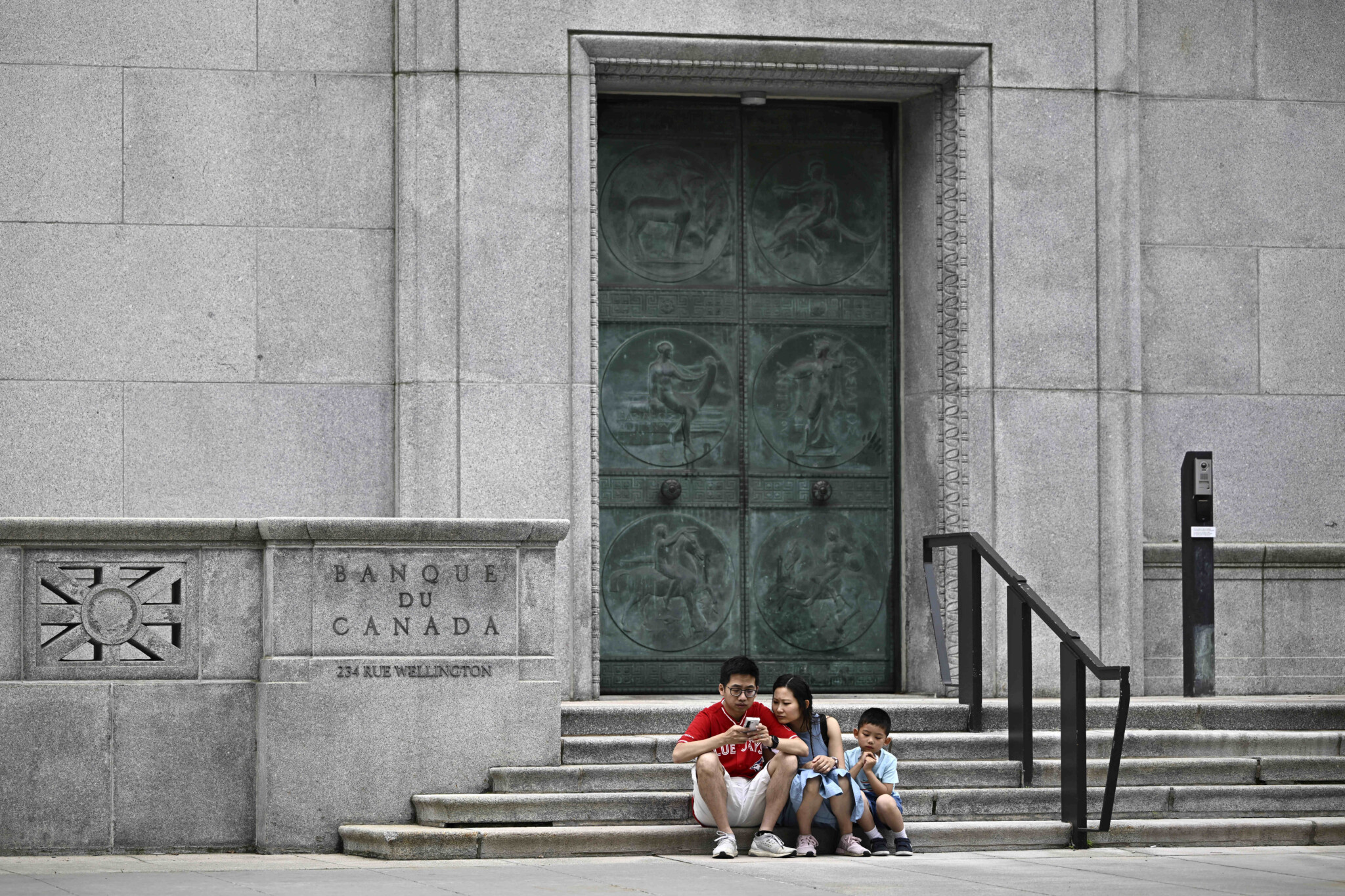 A family takes a break on the steps of the Bank of Canada building in Ottawa, on Wednesday, July 24, 2024. Justin Tang/The Canadian Press.