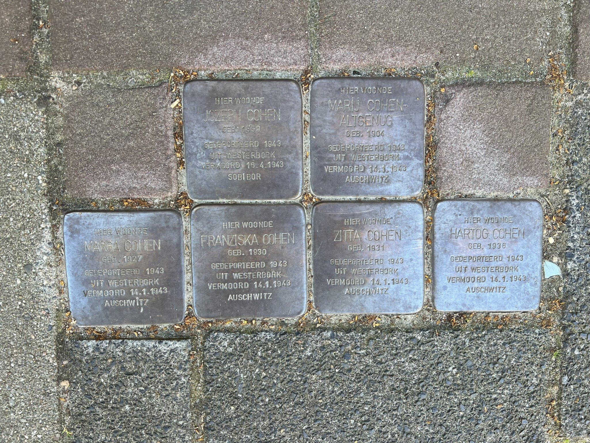 Stumbling stones commemorating the Cohen family, my grandfather’s neighbours on JosefIsraelstraat street in Groningen, Netherlands. There were three more next to this photo. They were all murdered in concentration camps. Photo credit: Brian Dijkema.