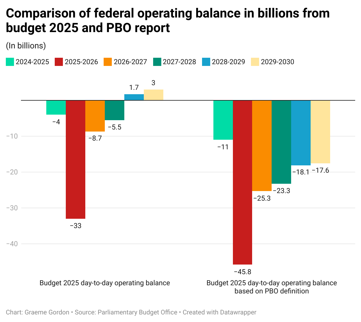 In the budget, Finance Minister Francois-Philippe Champagne had projected that future federal deficits would strictly be used to cover funding capital investments by 2028-29. The government plans to run a $78.3 billion deficit this fiscal year (more than double what the Trudeau government projected the deficit for 2025-26 would be), followed by slightly declining deficits of $65.4 billion, $63.5 billion, $57.9 billion, and $56.6 billion for the next four years. However, the PBO calculated that the Liberal government only has a 7.5 percent chance of attaining the goal of a declining deficit-to-GDP ratio due to the increased spending in government operations.
