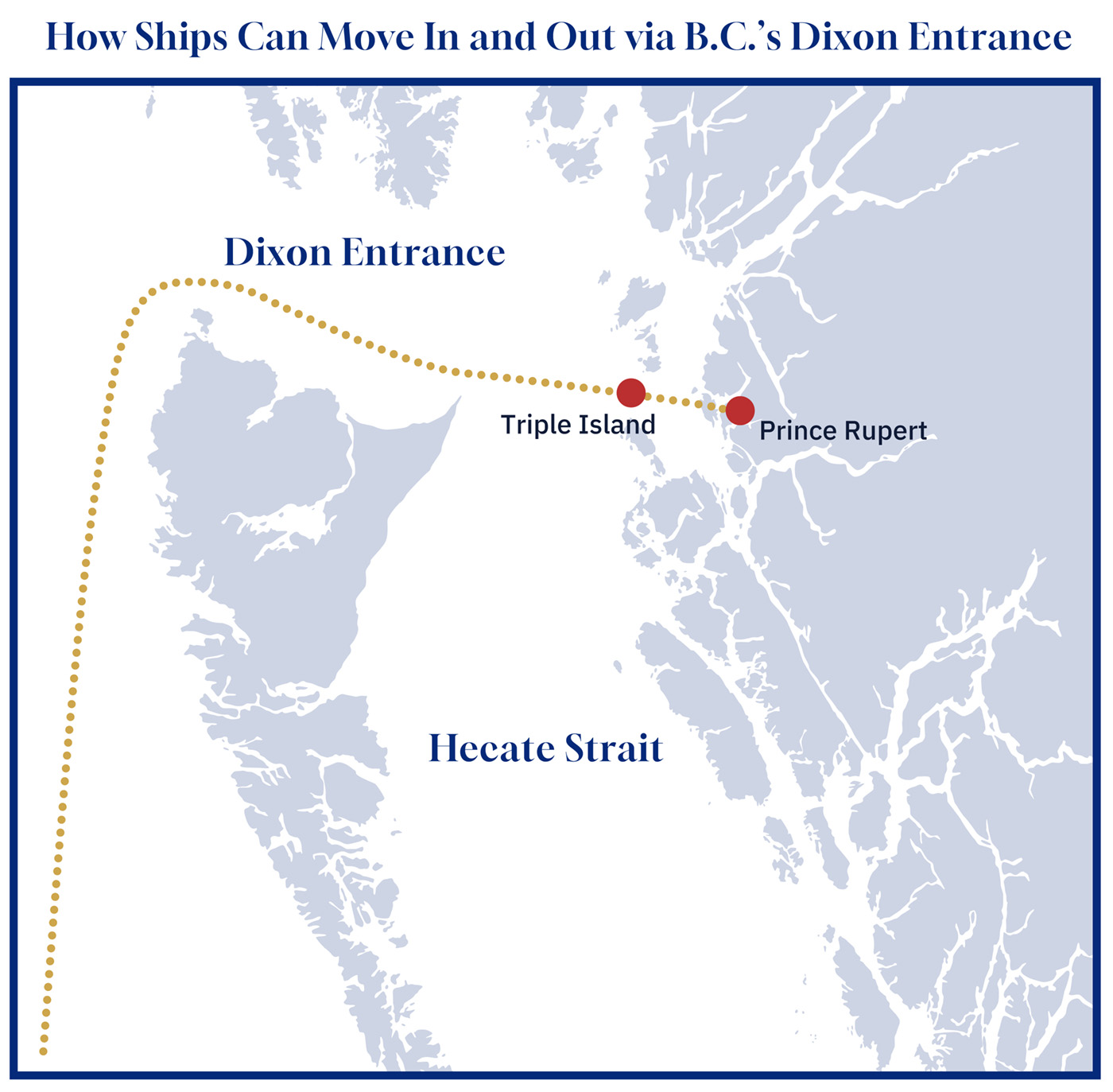 Prince Rupert’s deep-sea traffic does not enter or exit via Hecate Strait exclusively. The port’s commercial marine gateway is Dixon Entrance, a wide and deep outer channel along the Alaska–B.C. boundary.