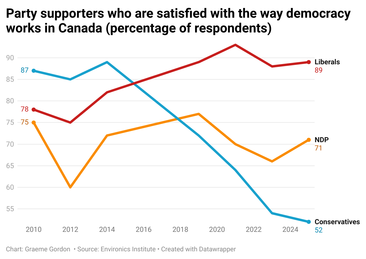 Overall, 70 percent of Canadians were satisfied with how our democracy works, rising five percentage points from the previous 2023 Environics survey.