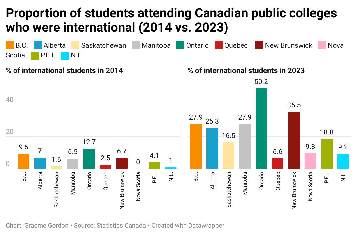 Within nine years, the makeup of enrolled students attending Canadian public colleges changed dramatically, with international college students growing five times larger.