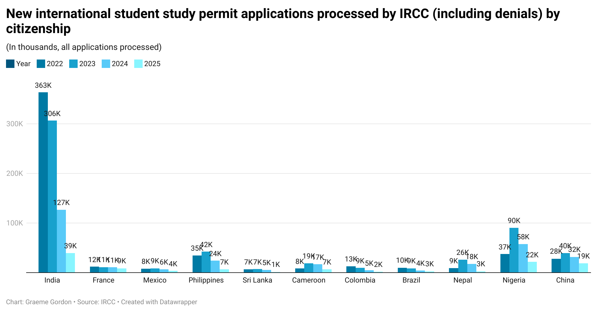 The caps and more stringent process for application approvals have led to far fewer applications, especially from Indian students. In the first nine months of 2025, 39,250 Indians applied for new study permits at Canadian post-secondary institutions, way down from Indian application numbers from the previous three years: 363,315 (2022), 306,415 (2023), 126,870 (2024).