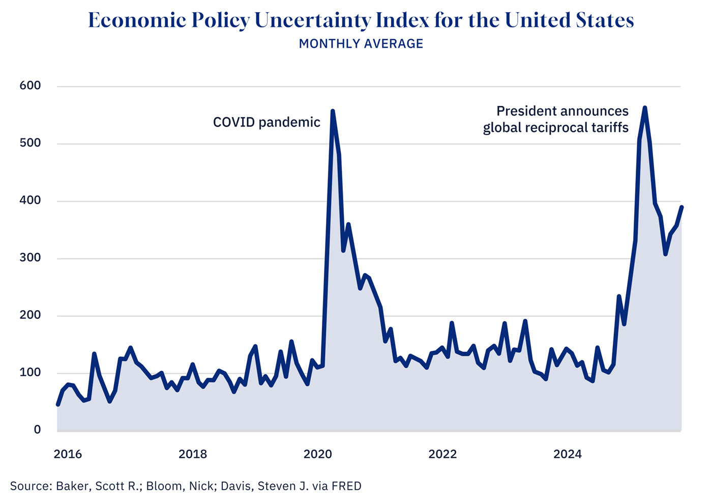Businesses don’t seem very optimistic either. While expectations for future sales are reasonable, the Economic Policy Uncertainty Index—which tracks uncertainty around government decisions and their economic impact—has risen to levels not seen outside the pandemic. Research shows that high uncertainty tends to weigh on future business investment.