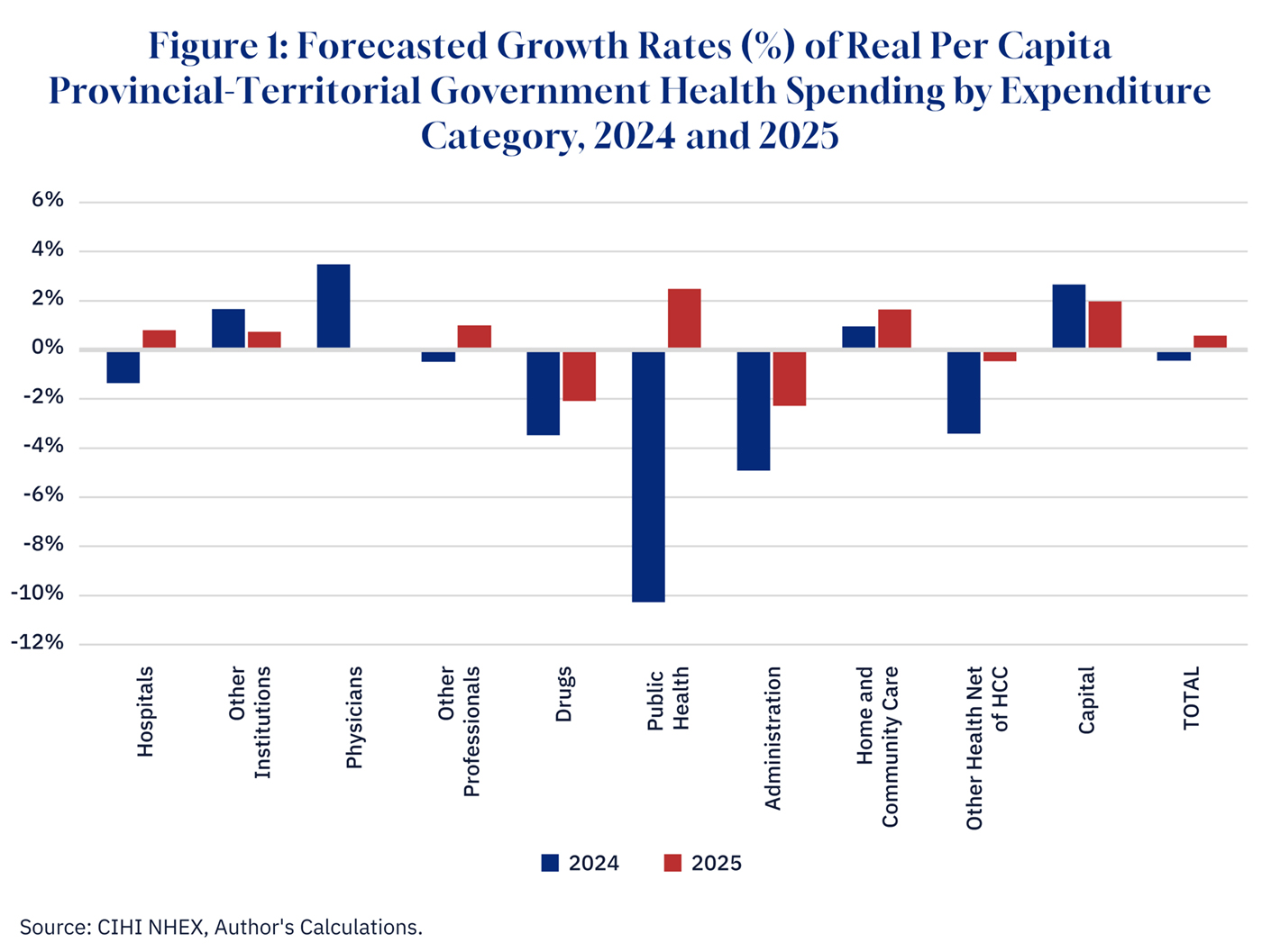 Figure 1 plots the growth rates of real per capita provincial-territorial government health spending by category for 2024 and 2025. The categories with consecutive increases of spending adjusted for population and inflation are other institutions (mainly long-term care), home and community-based care, and capital. Hospital expenditure is expected to grow 0.8 percent in 2025 but after a 1.4 percent decline in 2024.